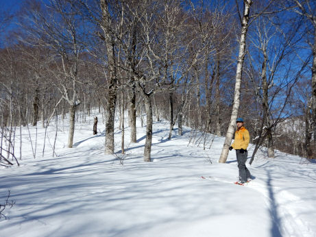 キリンテ沢を少し登り、左の尾根に上がる。この時期としてはめずらしい穏やかな天気で、しばらく里雪型だったため新雪は浅く、お気楽ハイキング。